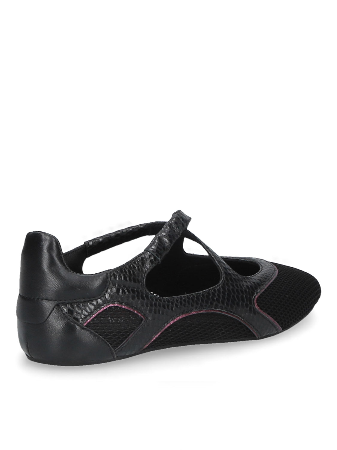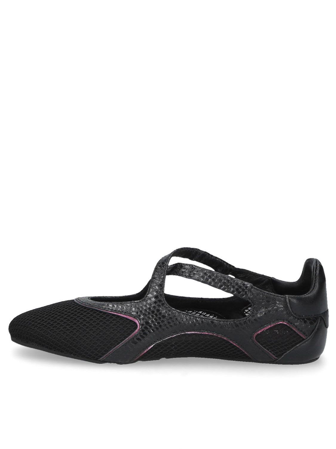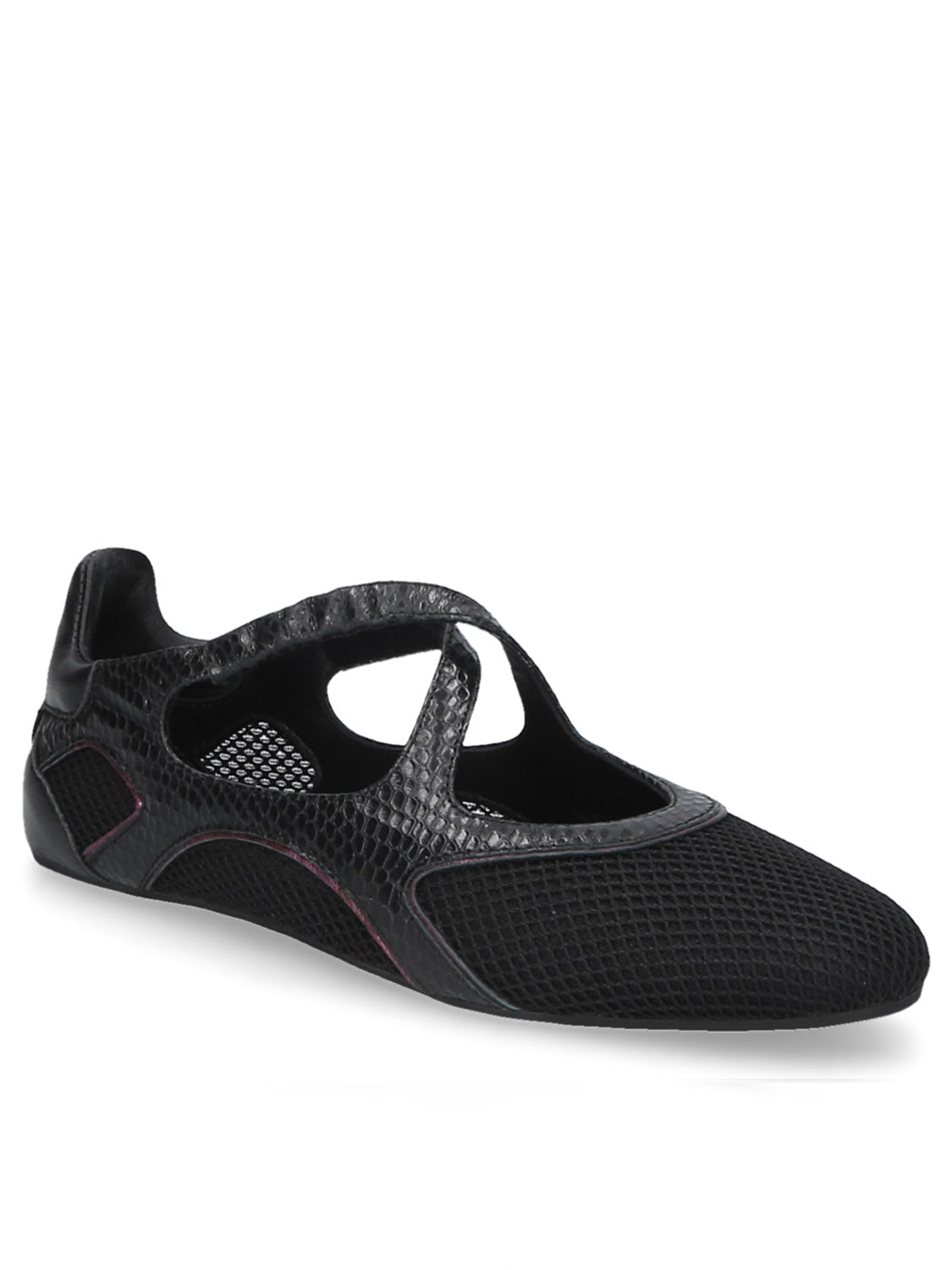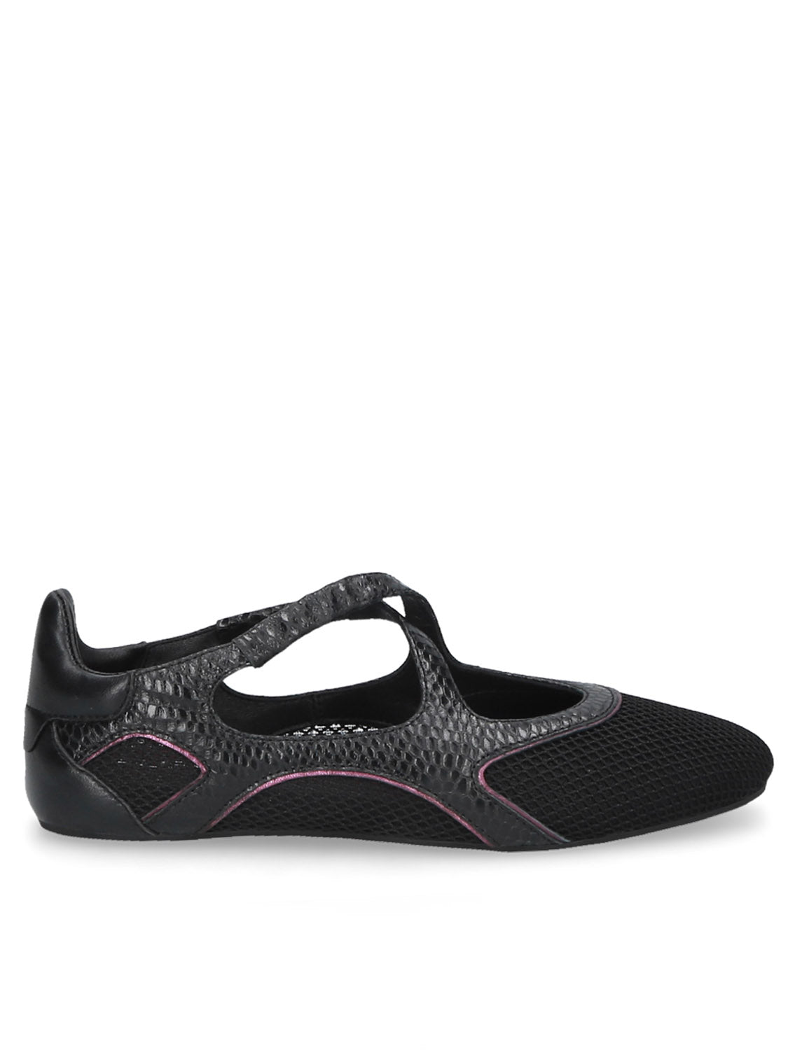 Sneaker flat dal gusto contemporaneo, con tomaia in pelle e tessuto sintetico nero che combina struttura e leggerezza.