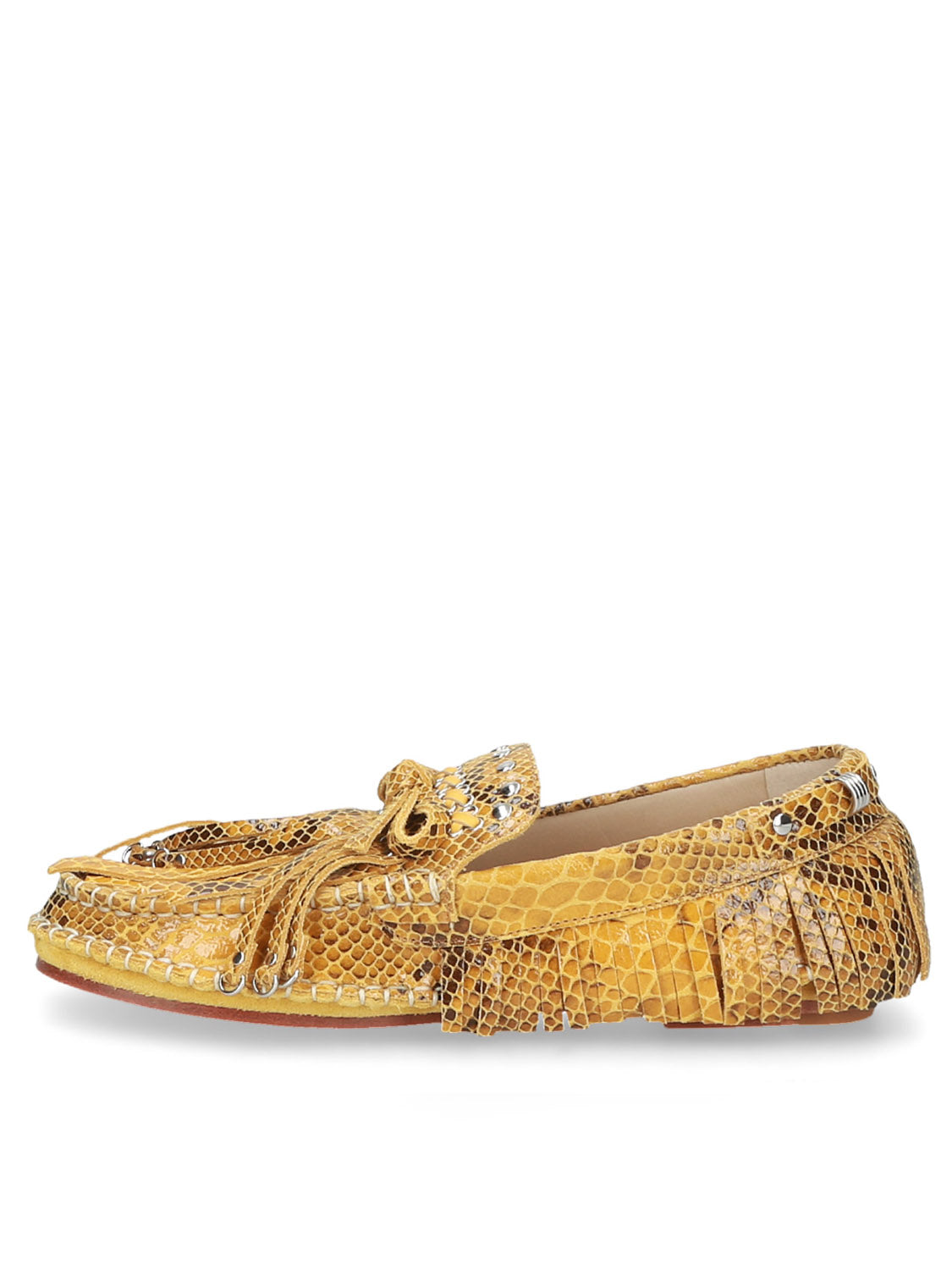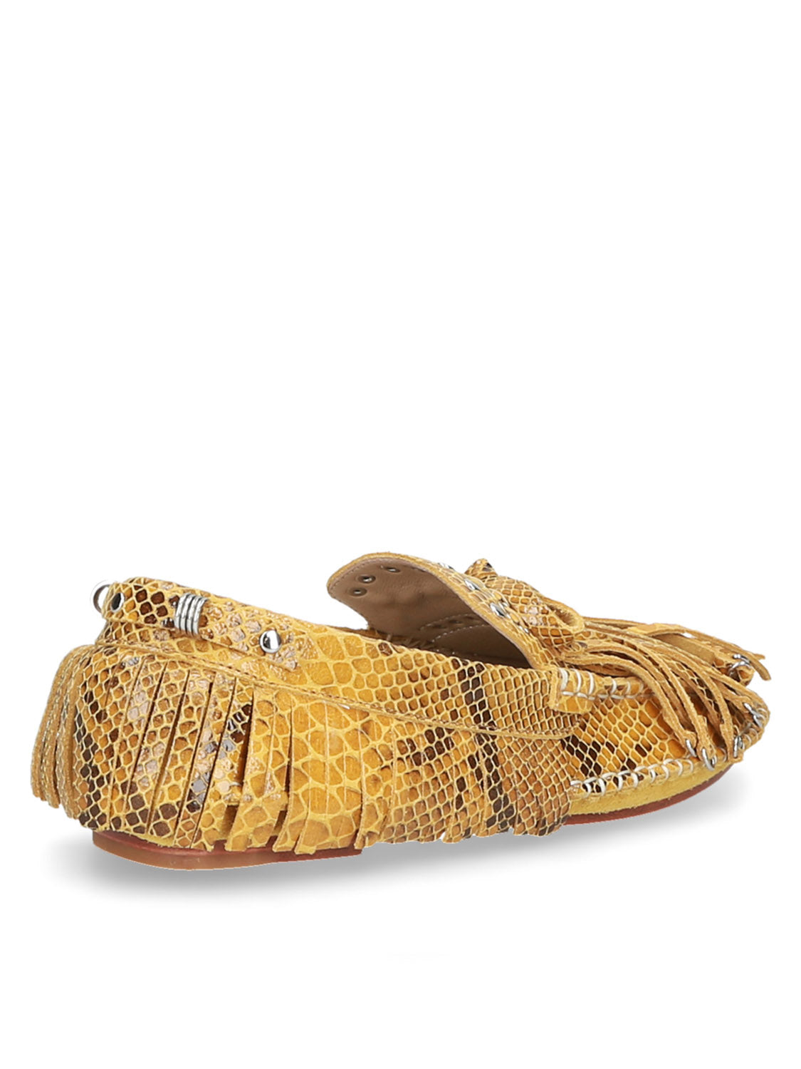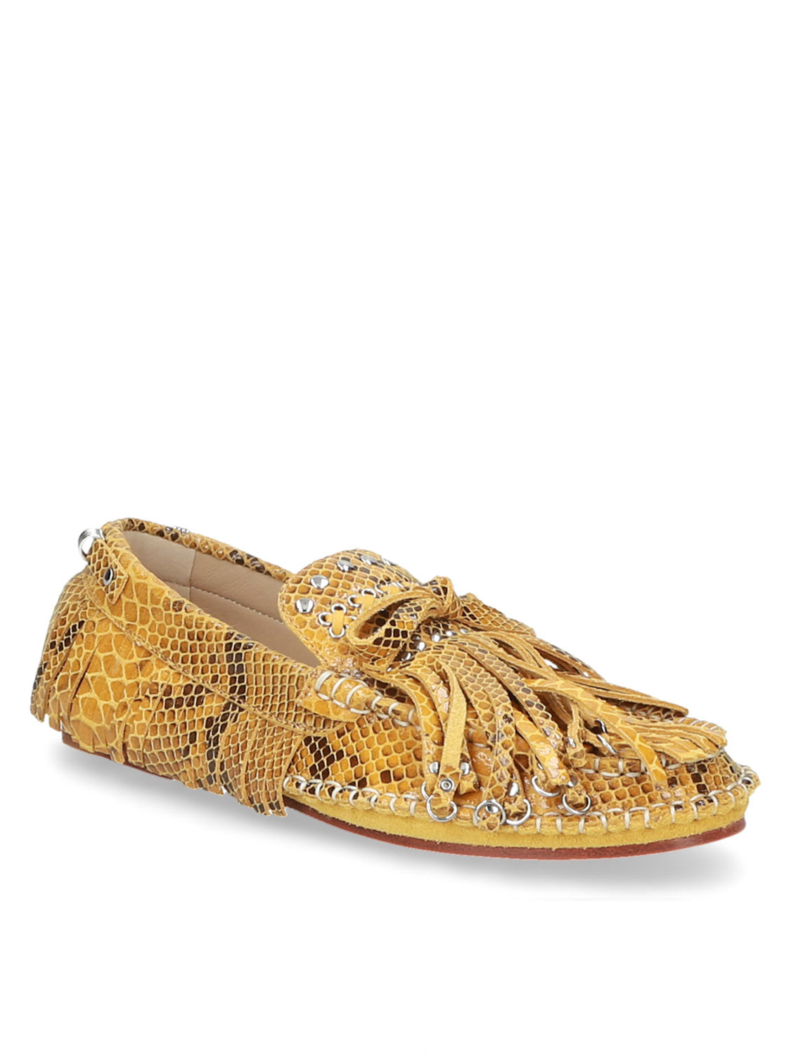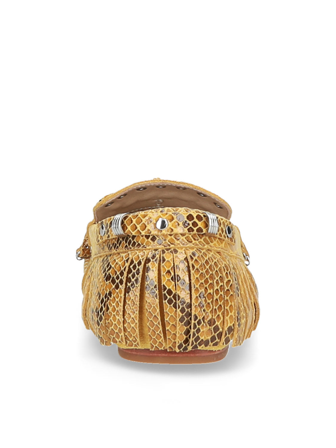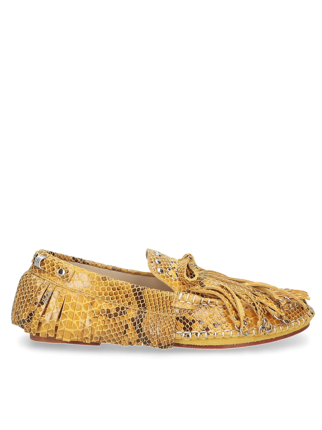 Mocassino audace in pelle stampata con frange giocose e dettagli in metallo a occhiello per un look boho d'impatto.
