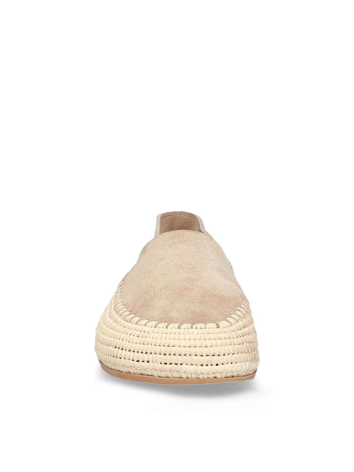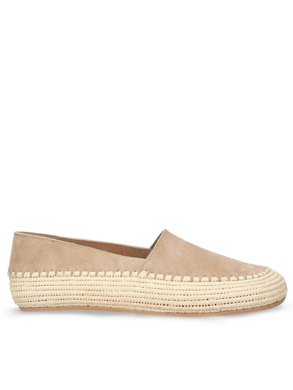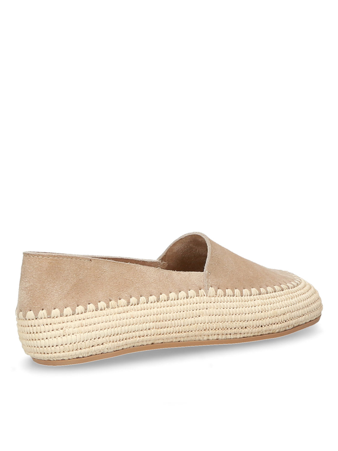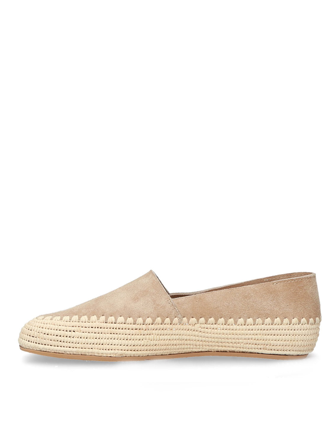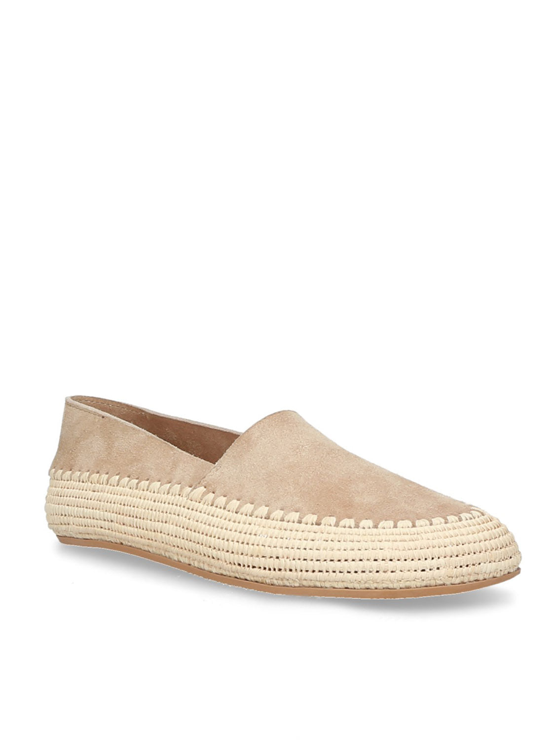 Mocassino in pelle scamosciata dal gusto naturale e raffinato, impreziosito da un ricamo color ecru che illumina la linea con discrezione.