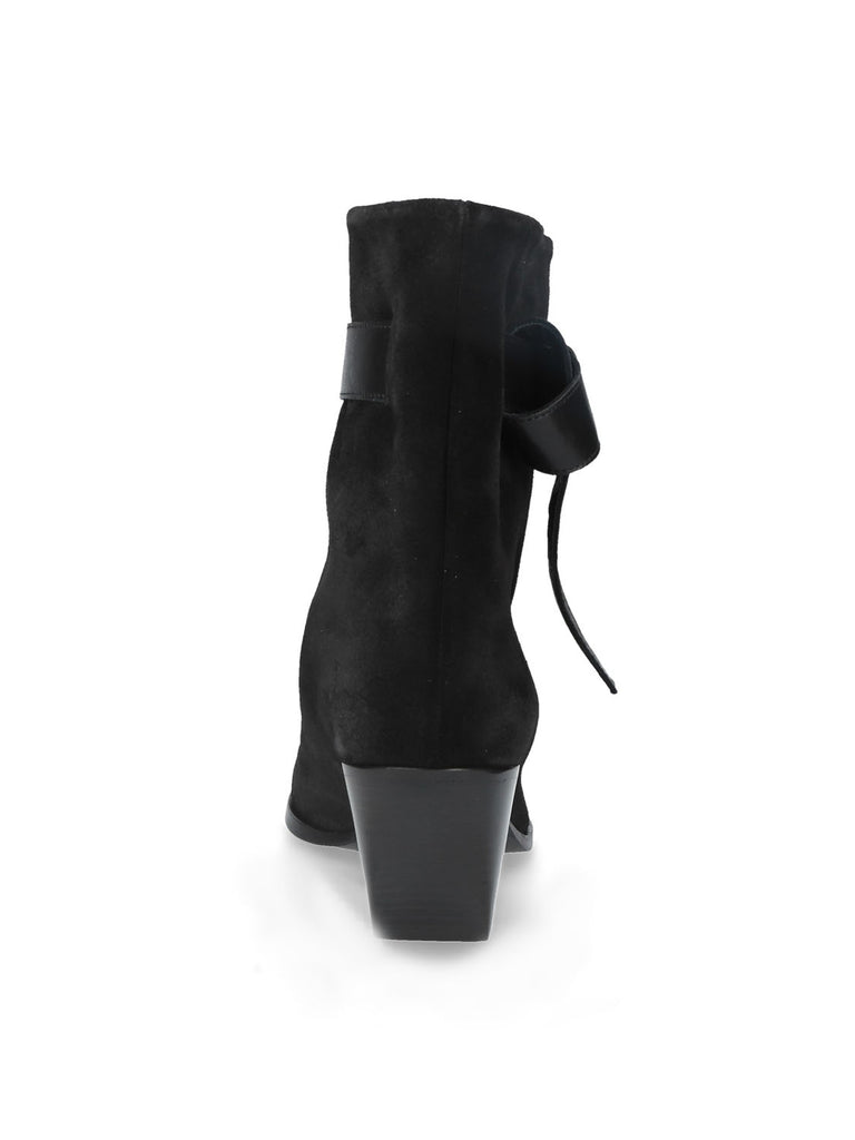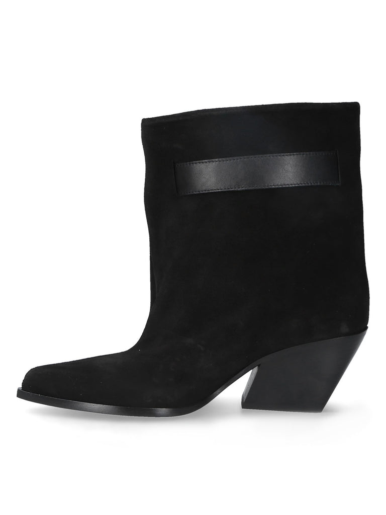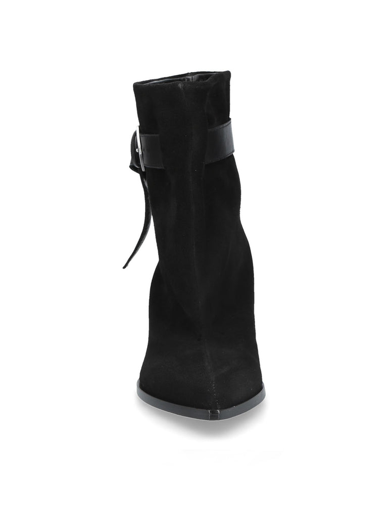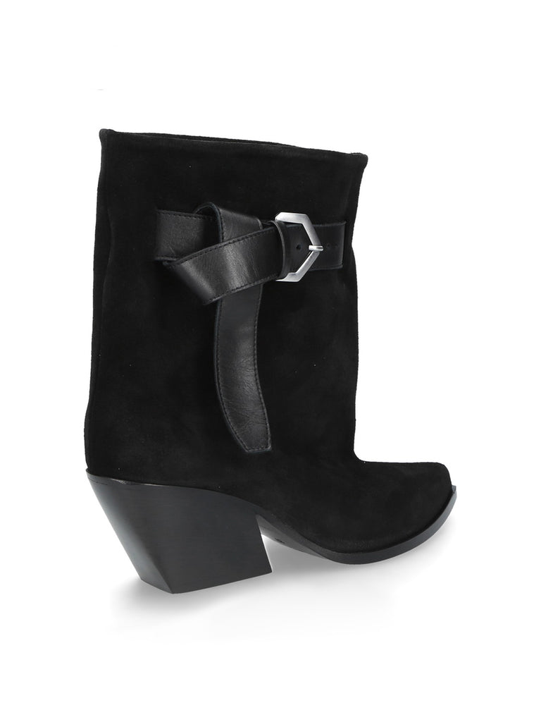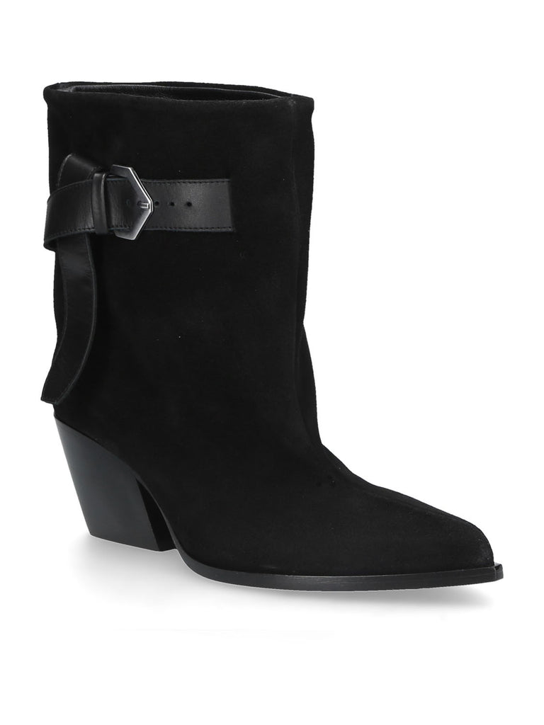 Stivaletto texano in pelle scamosciata nera, dal profilo grintoso e distintivo. La linea morbida del gambale e il cinturino laterale con fibbia valorizzano il pellame scamosciato, aggiungendo un'eleganza decisa a un design moderno.