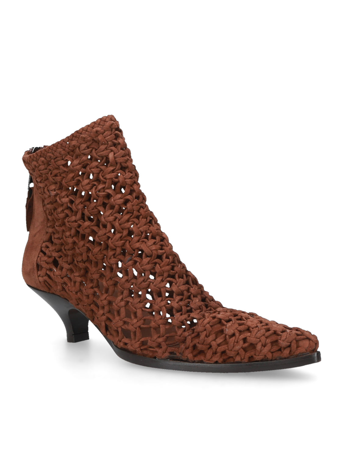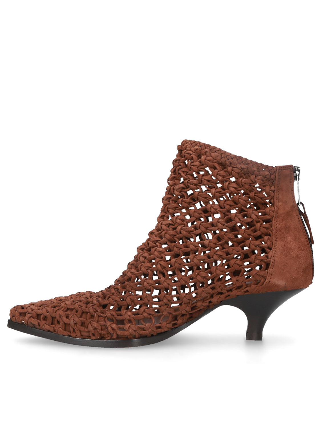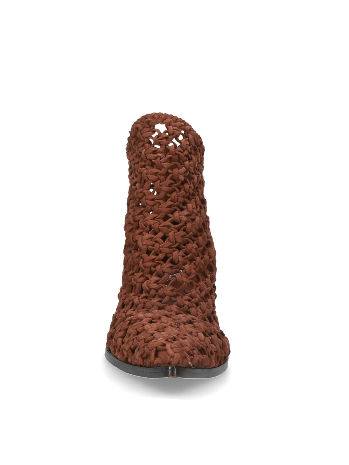 Tronchetto in pelle intrecciata colore brown dal design scultoreo e contemporaneo, con una tomaia che crea texture e movimento.