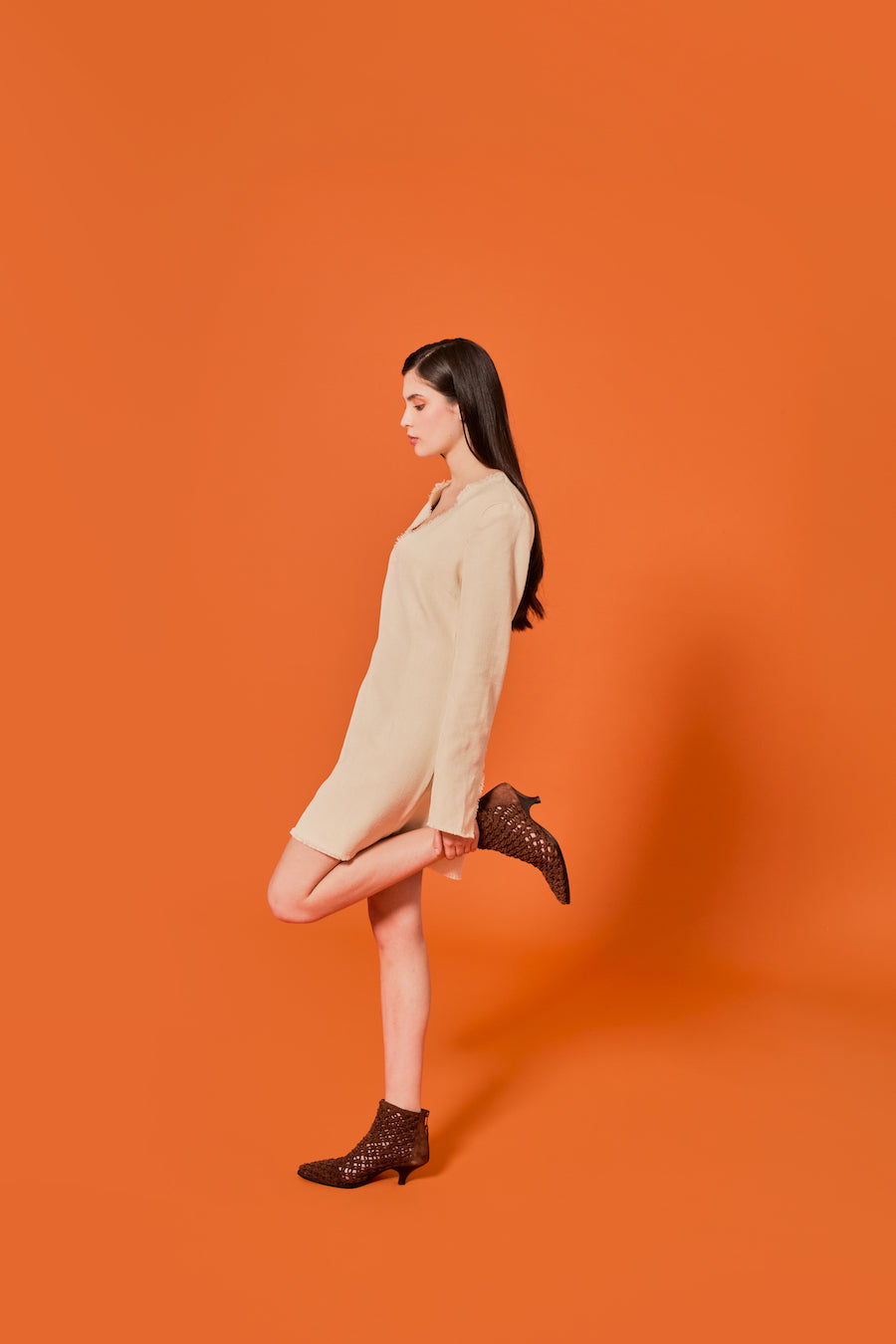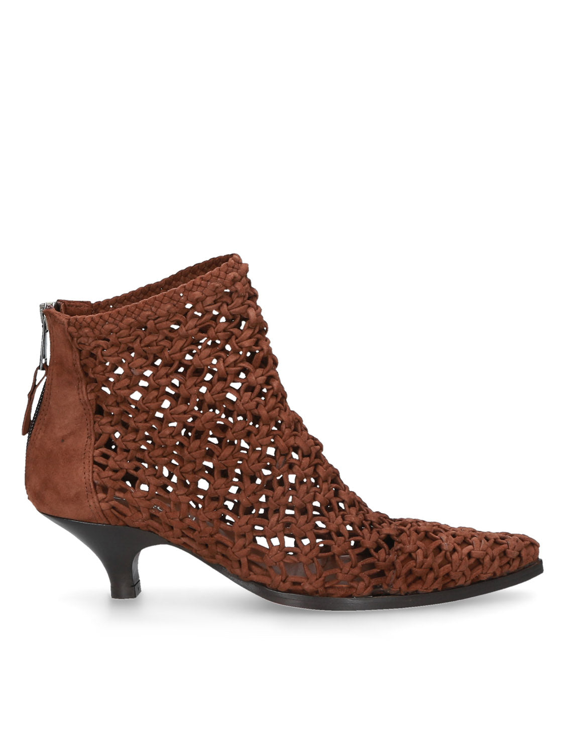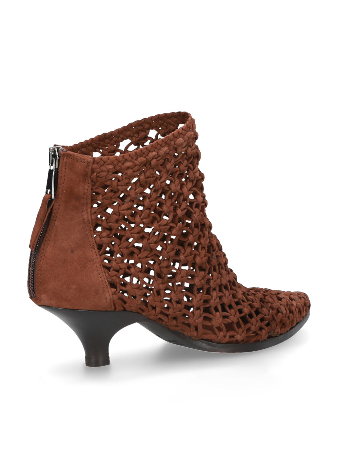 Tronchetto in pelle intrecciata colore brown dal design scultoreo e contemporaneo, con una tomaia che crea texture e movimento.