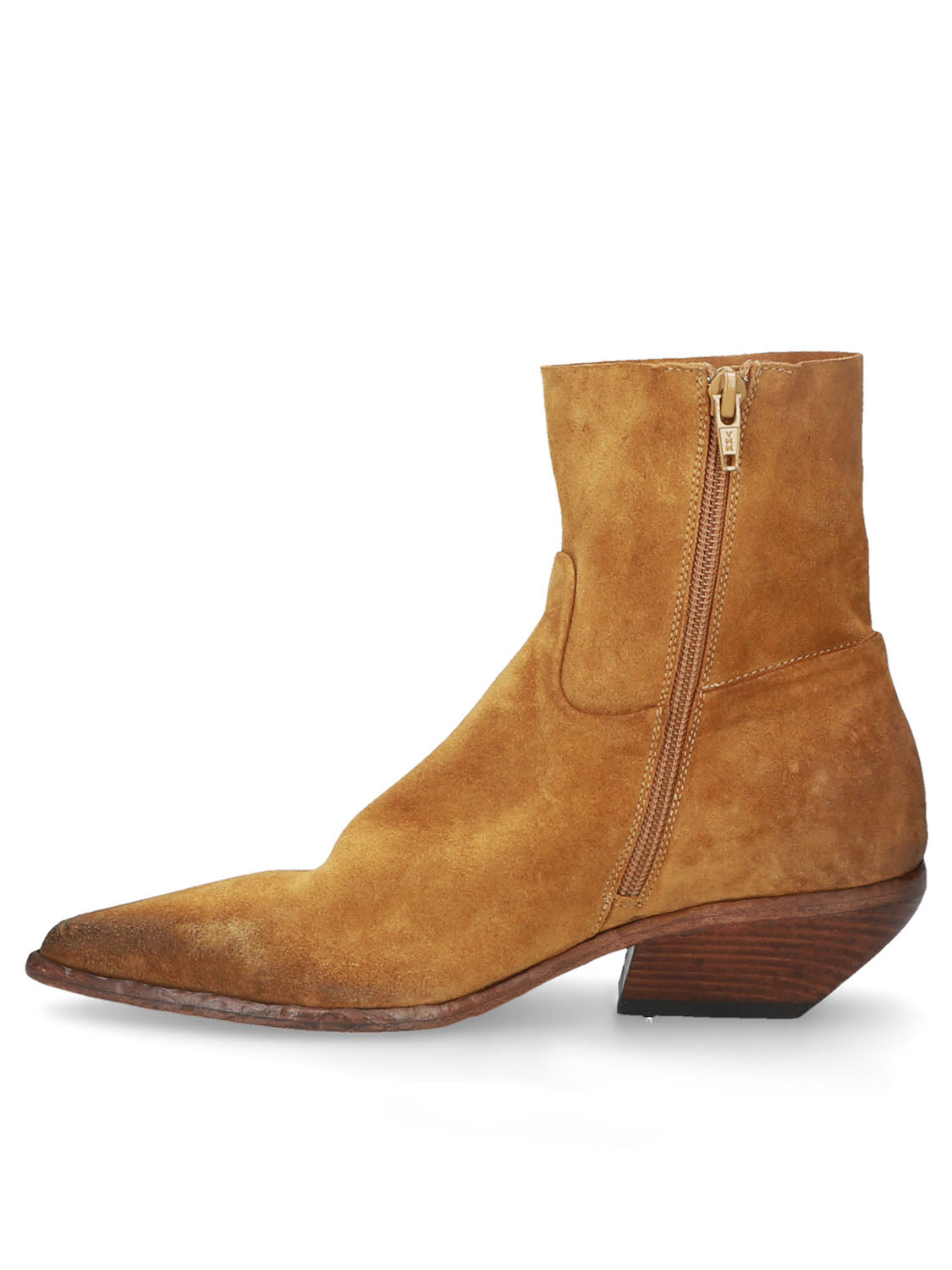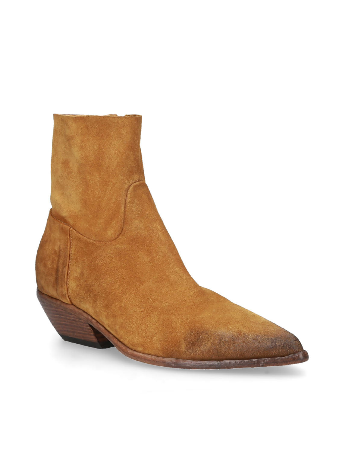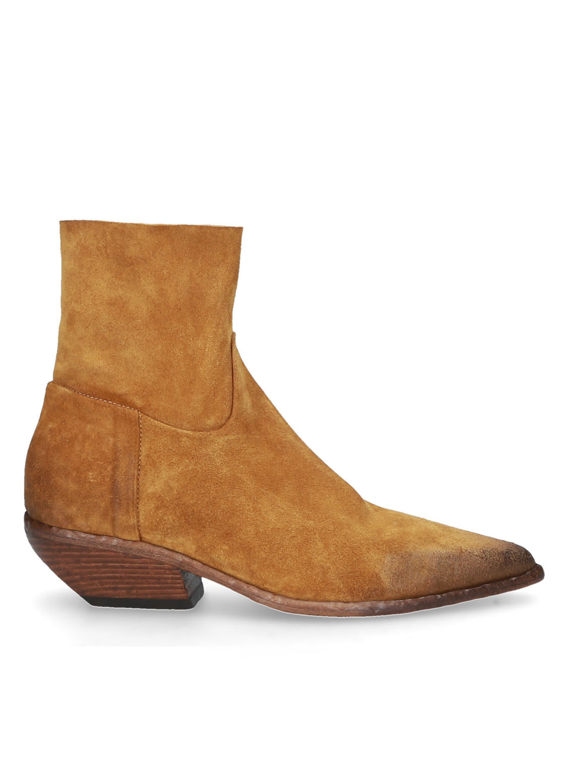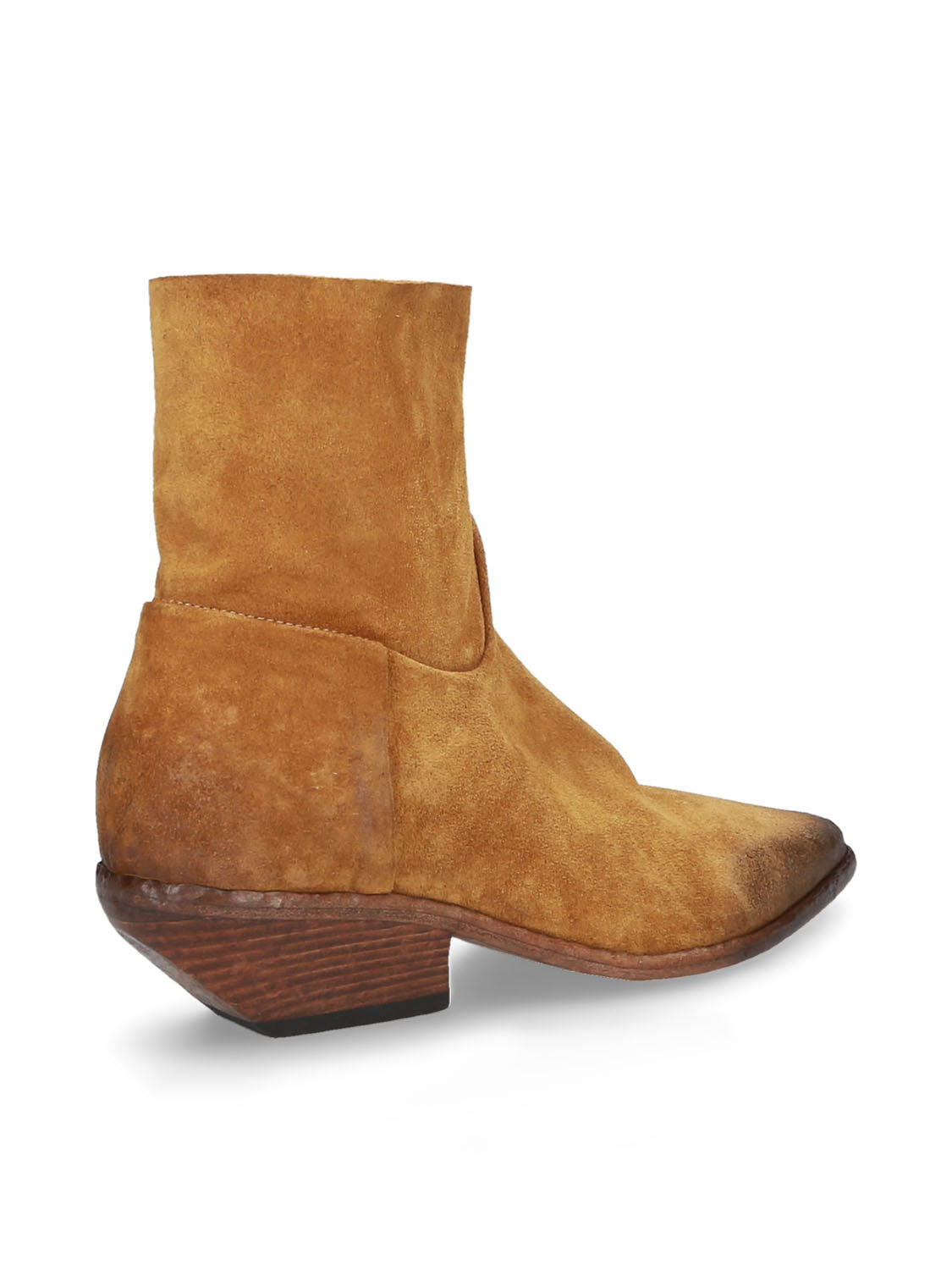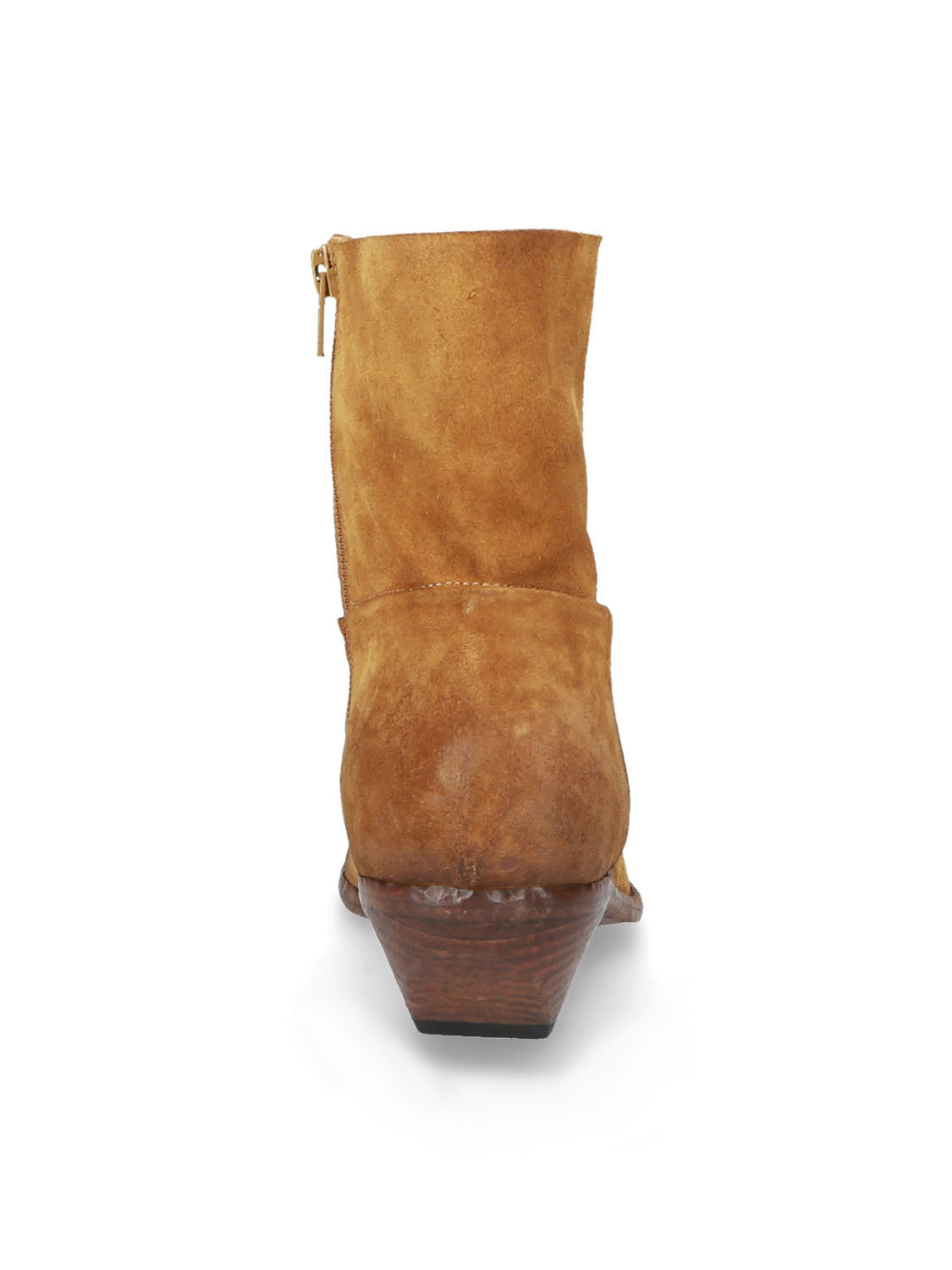 Tronchetto in pelle scamosciata dal gusto texano, essenziale ma pieno di carattere.