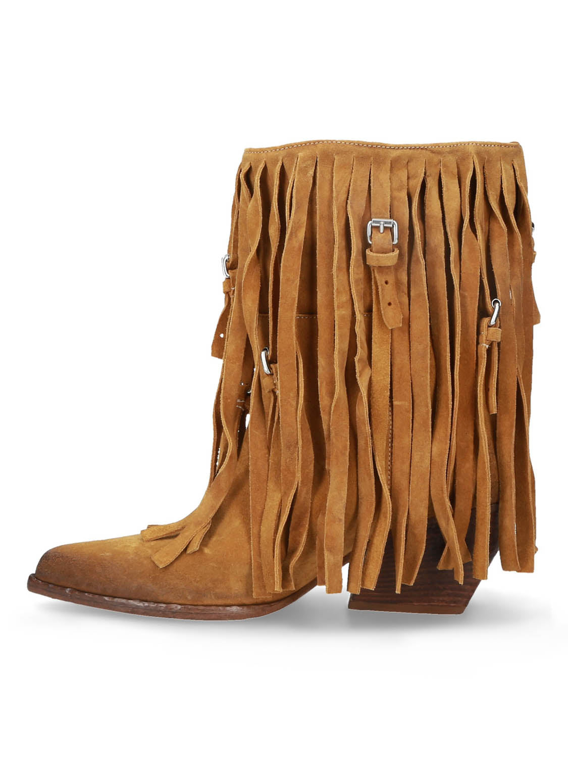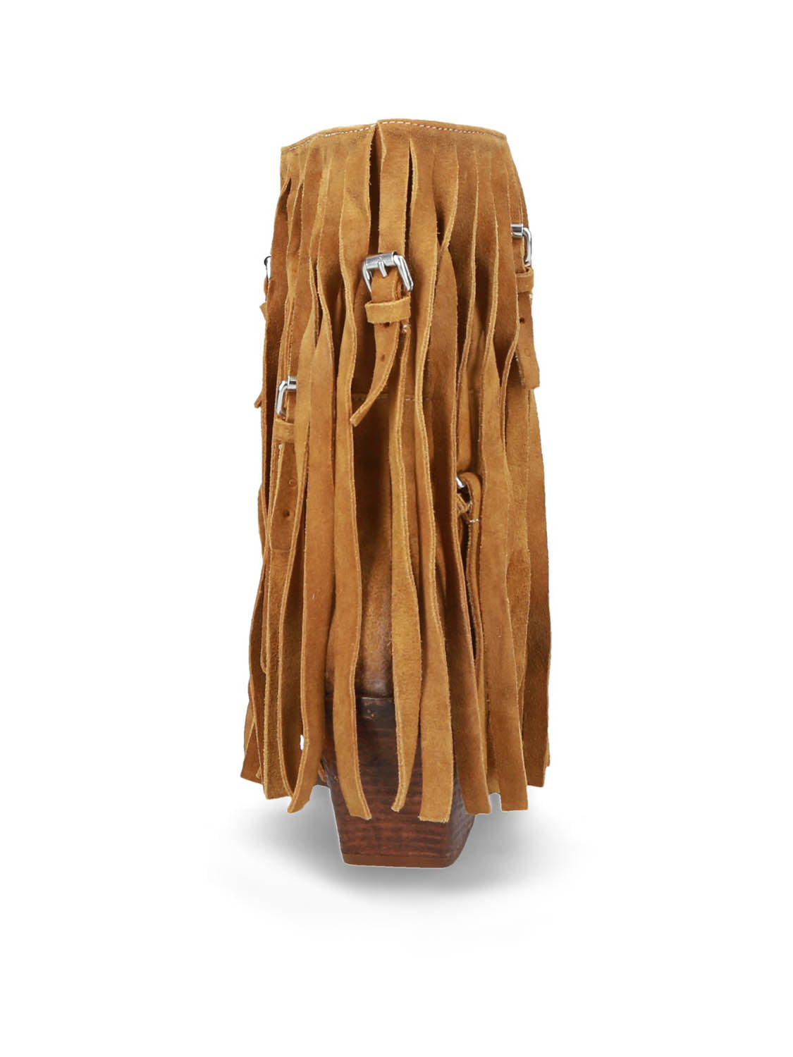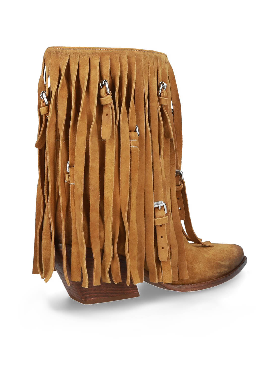 Tronchetto in pelle scamosciata dal carattere deciso e contemporaneo. Le frange sovrapposte e le fibbie metalliche decorative creano movimento e personalità, valorizzando la silhouette con un distintivo richiamo western.