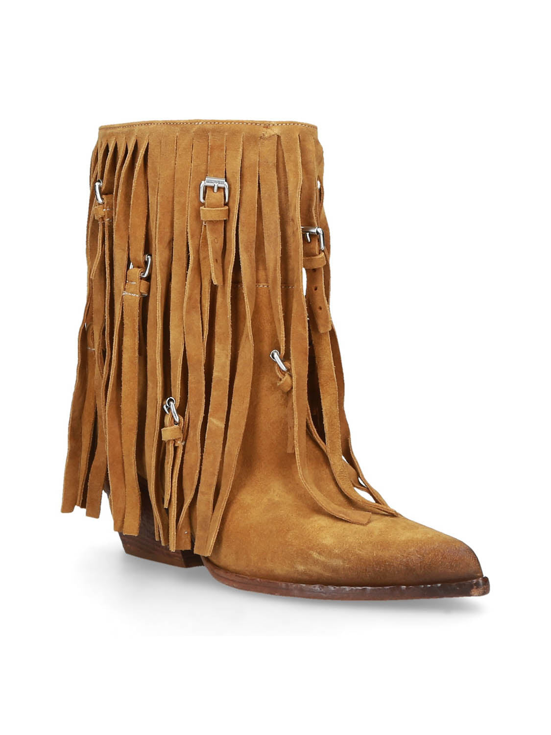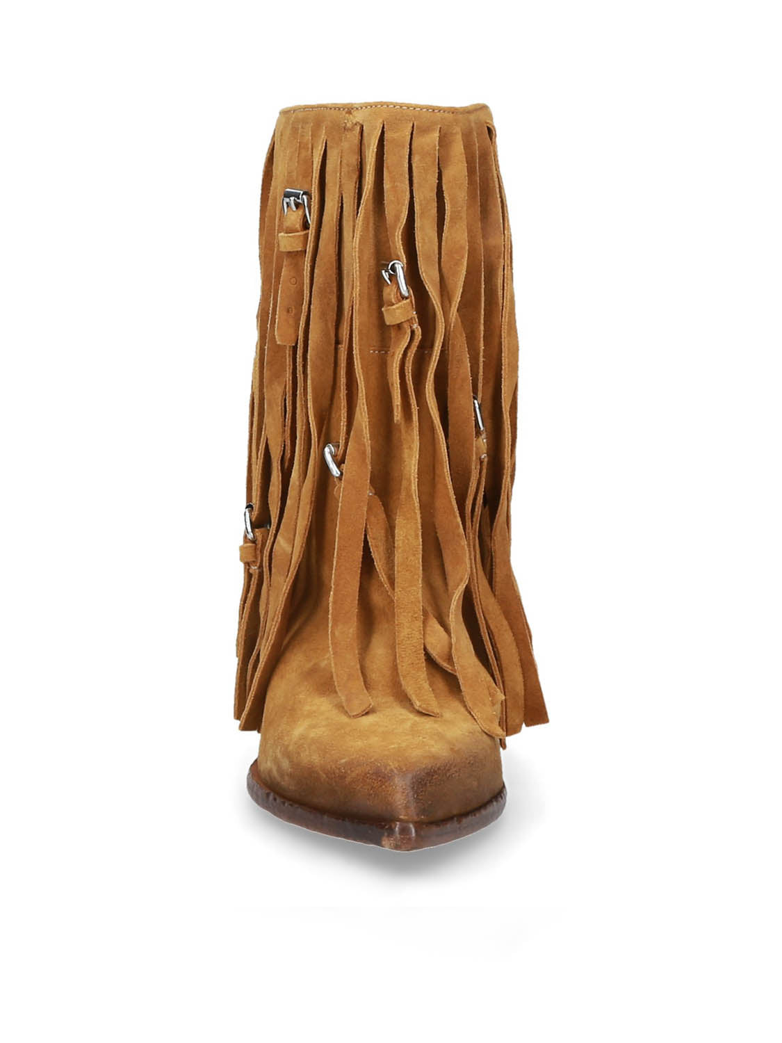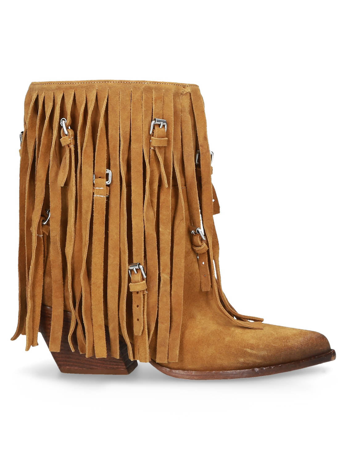 Tronchetto in pelle scamosciata dal carattere deciso e contemporaneo. Le frange sovrapposte e le fibbie metalliche decorative creano movimento e personalità, valorizzando la silhouette con un distintivo richiamo western.