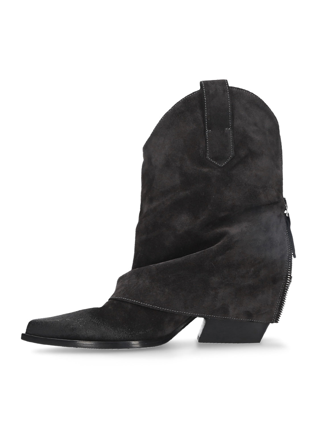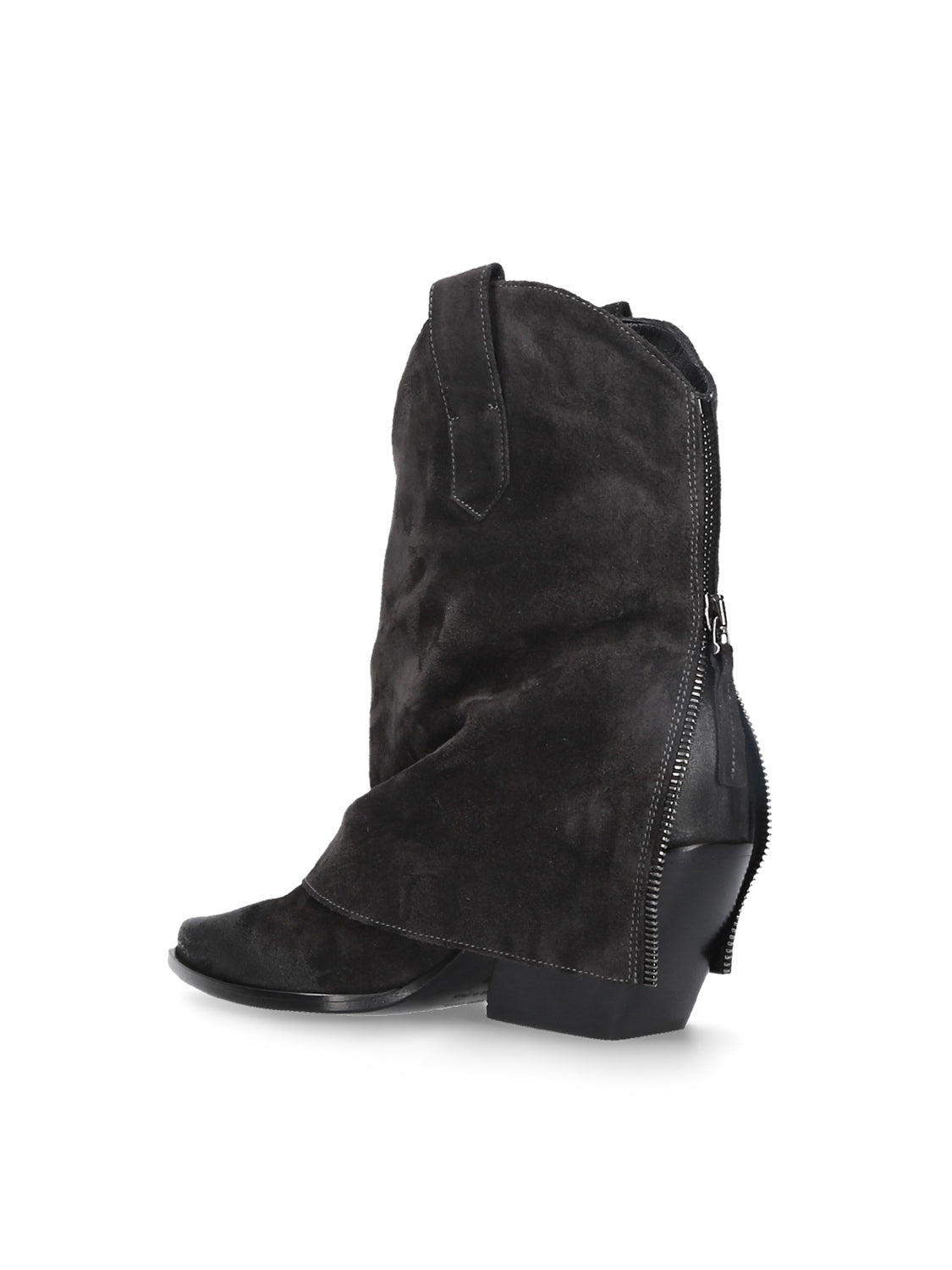 This Texan ankle boot, made of suede with an inverted shaft, features a 70mm heel that slims the figure without sacrificing stability.