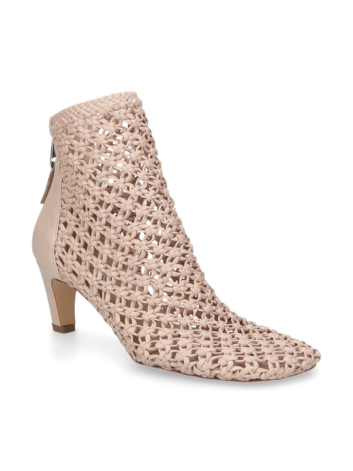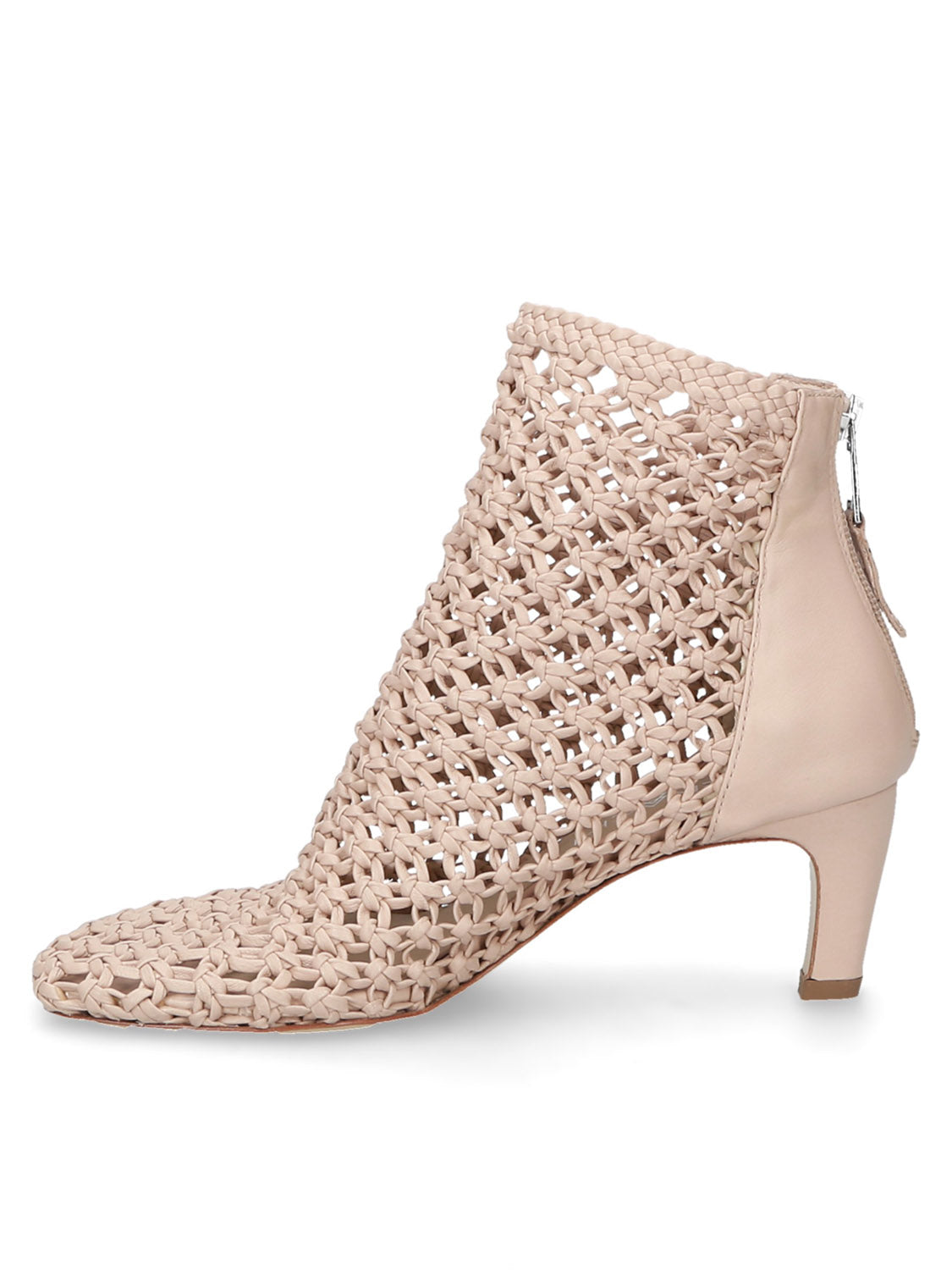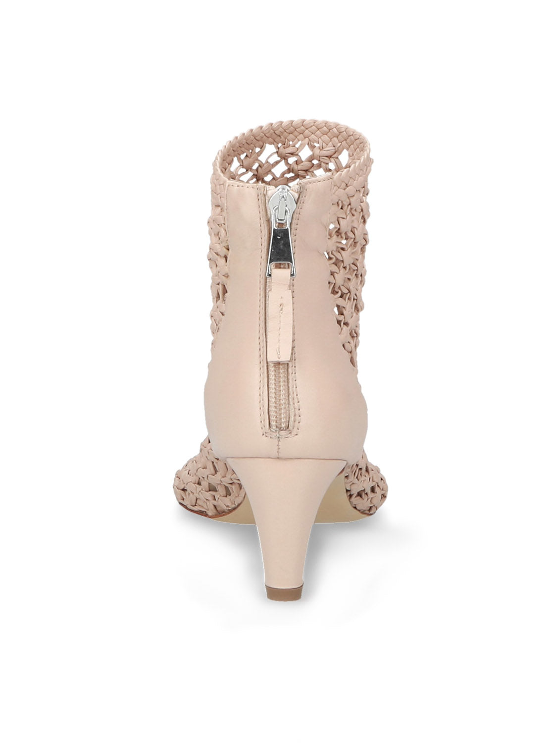 Tronchetto in pelle intrecciata colore cipria dal design scultoreo e contemporaneo, con una tomaia che crea texture e movimento.